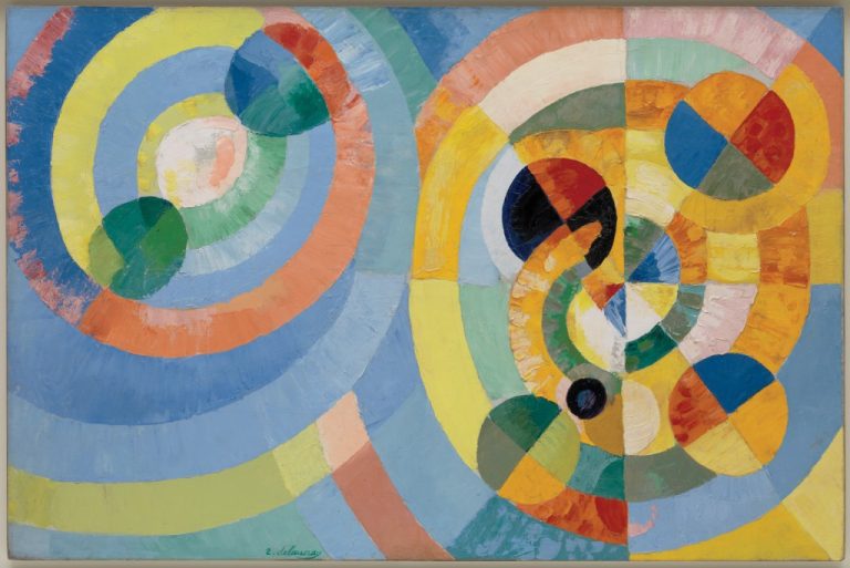 The main ambitions of these painters were visual rather than intellectual. The Delaunay family paid close attention to the Post-Impressionist innovations of Georges Seurat and Paul Signac, as well as the scientific color theory of French chemist Michel Eugène Chevreul. But the “contrast” through which they construct the image is not just visual or chromatic. Orpheus imagery provides an emotional response to the conditions of modern life in the metropolis and its increasingly cinematic, commercial, and mechanized sights and sounds.