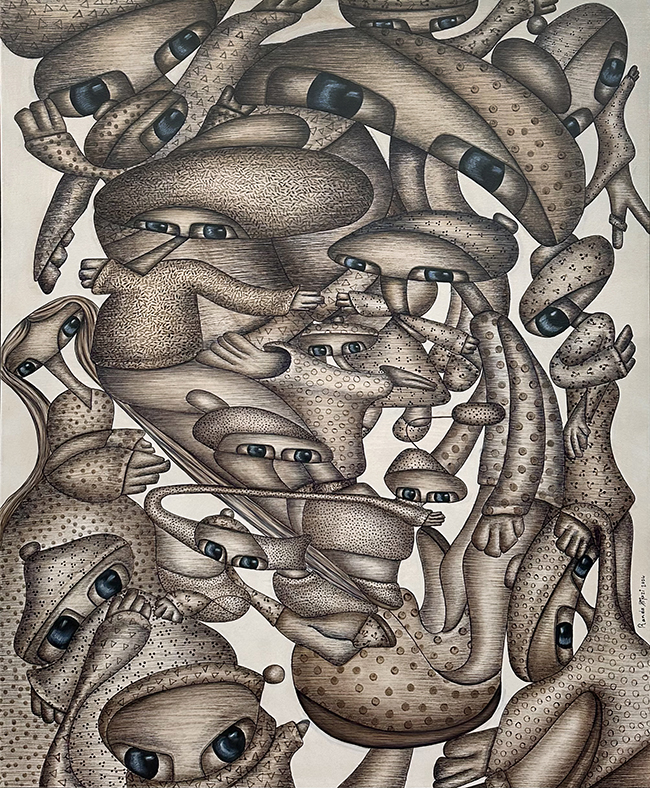 In Anticipation, Hijazi presents a dense gathering of figures, all rendered in muted beige tones. The 170 x 140 cm mixed media piece captures a crowd frozen in a moment of quiet expectancy. Their postures and expressions range from contemplative to uncertain, evoking a shared sense of waiting. With no background to distract, the focus remains on the figures themselves, emphasizing their collective humanity.