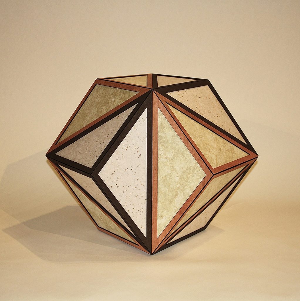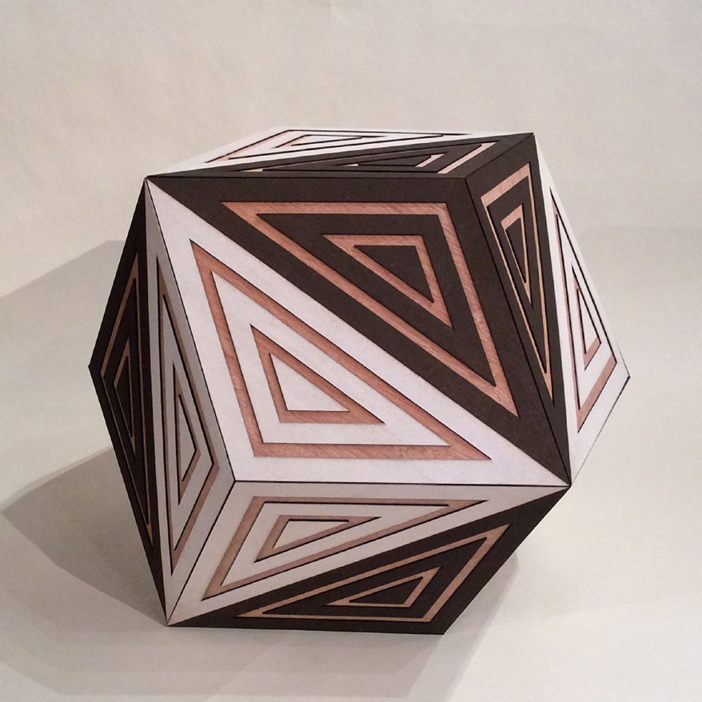 In Platonic Symmetries of Truth and Beauty, Hinnant crafts a vibrant dialogue between material and meaning. Measuring 24 inches by 26 inches by 24 inches, this sculpture combines polychromed woods with exotic pigmented papers. The piece draws inspiration from Platonic ideals, referencing the enduring concepts of truth and beauty through its intricate geometry and balanced design.