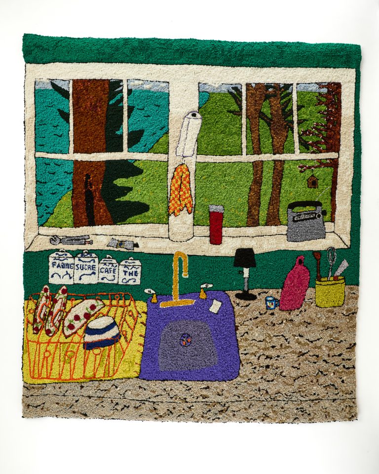 Installed throughout the seven floors of the Maxon Mills building, AKA Wassaic Project in Wassaic, nine artists build their own worlds. Curated by Eve Biddle, Bowie Zunino, Jeff Barnett-Winsby, and Will Hutnick, the various installations of mixed media artworks reveal a range of creative focus and fantastical thinking. Paolo Arao’s sewn cotton “In Verse” (2024) and “Intervals (Prisms)” (2024) are strikingly geometric, while Amira Pualwan’s handwoven cotton “Flame v Flood” (2023) appears to vibrate with a graphic pulse. “Kitchen Window” (2024) by Mary Tooley Parker is an impressive work of hooked tapestry that details a common kitchen scene with such sensitivity that I found myself moved to tears, and“Honey” (2024) by Dana Robinson is a lovely Dada-inspired collage of random objects that float along in a timeless realm. “You are now Egungun: (2017) by Jamal Ademola is the futuristic representative from A Space Between World — it depicts a figure that looks as if it stepped right out of a Nick Cave work, cloaked in an outrageous glittery ensemble.