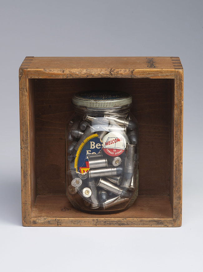 For Clint, growing up in a church-going family, these spaces symbolized protection and community. But today, churches are no longer immune to the epidemic of violence. The assemblage critiques this shift, incorporating elements of religious iconography and subtle, haunting details.