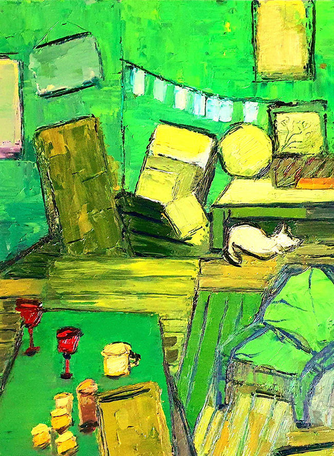 Tsitsela’s third piece from 2024 steps away from the figure and into a space that’s just as personal: her studio. It’s painted in oils on paper, and though it may seem like a simple room, it unfolds like a psychological space. Green dominates the painting—not a calm green, but a pulsing, layered one. It doesn’t feel like decoration. It feels like memory.