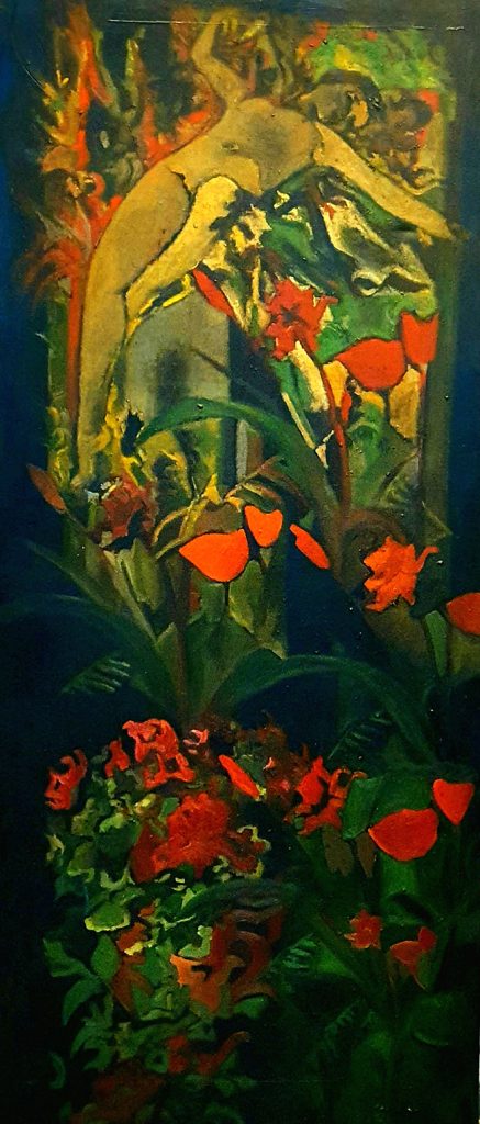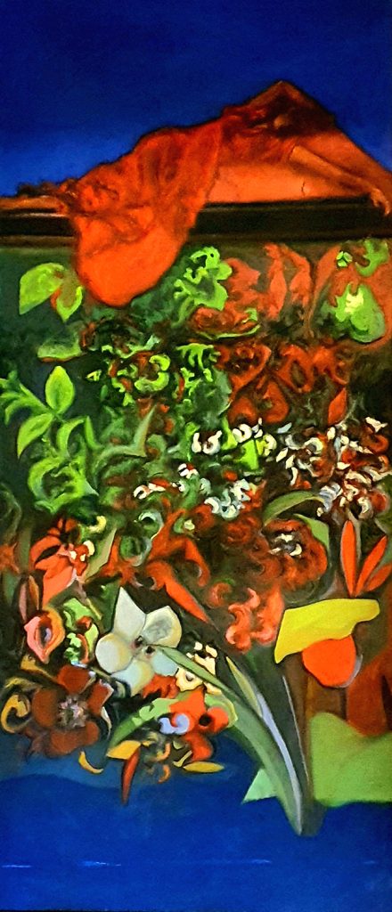 There’s nothing dainty about the flowers here. They push against the figure, almost overwhelming her, yet never quite swallowing her up. This creates a charged space where sensuality meets wildness, where vulnerability isn’t weakness but a fact of being human. The rawness of the paint, the intensity of color, and the lack of narrative combine to create an emotional immediacy. You’re not just looking at the painting—you’re feeling your way through it.