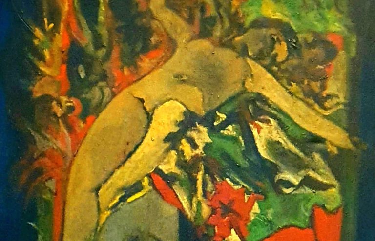 Another painting from the same year offers a quieter scene, but it doesn’t let go of its emotional grip. Again, the figure is nude and alone. No floral chaos this time—just her. She stands without context, suspended in color and brushstroke. Her posture is soft but weighted. There’s sorrow here, but not drama. She doesn’t weep. She just is.