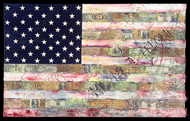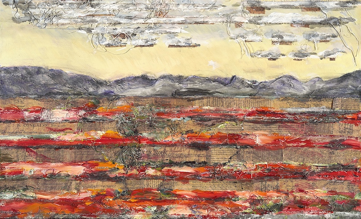 This piece sits right at the center of Morris’s current direction. In it, she works directly with the U.S. founding documents—not just as symbols, but as material. The Constitution and the Declaration of Independence appear not as static relics but as living, textured layers in the surface of the work.