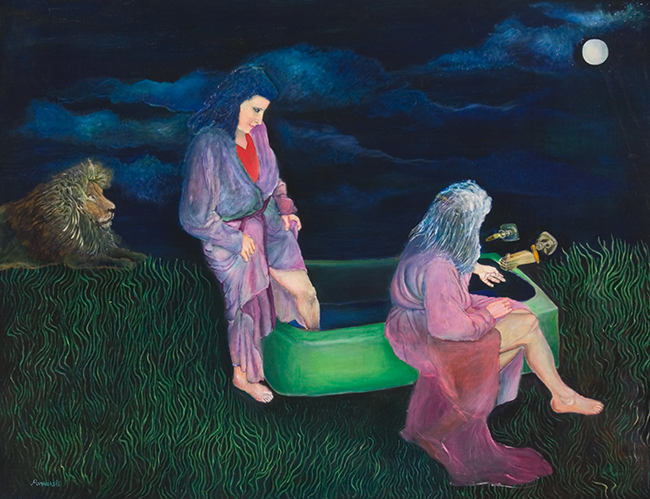 Bather’s Invention brings us somewhere else entirely. A hollowed-out tree. Mushrooms. A waterfall in the wild. It sounds like a dream, and in some ways it is—but the dream has structure. A lion finds the space and becomes its protector. Eve appears, interacting with the water as if trying to decode its ritual. There’s a practical side to this myth, too: she’s adjusting droplets, readying herself, preparing to cleanse. The moonlight overhead isn’t just atmospheric—it’s functional, giving her the visibility she needs. Poniarski mixes wild nature with symbolic gestures. The tree isn’t just a tree. The bath isn’t just for hygiene. Everything in the painting hints at rebirth, at the body’s relationship to the earth and the cosmos. There’s a push and pull between primal instinct and thoughtful care.