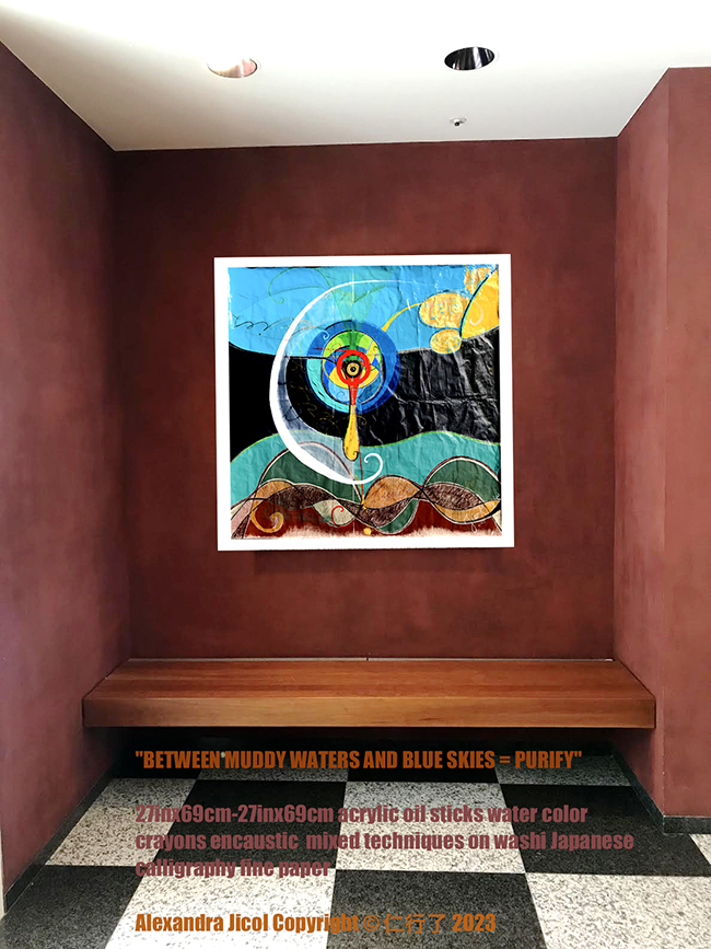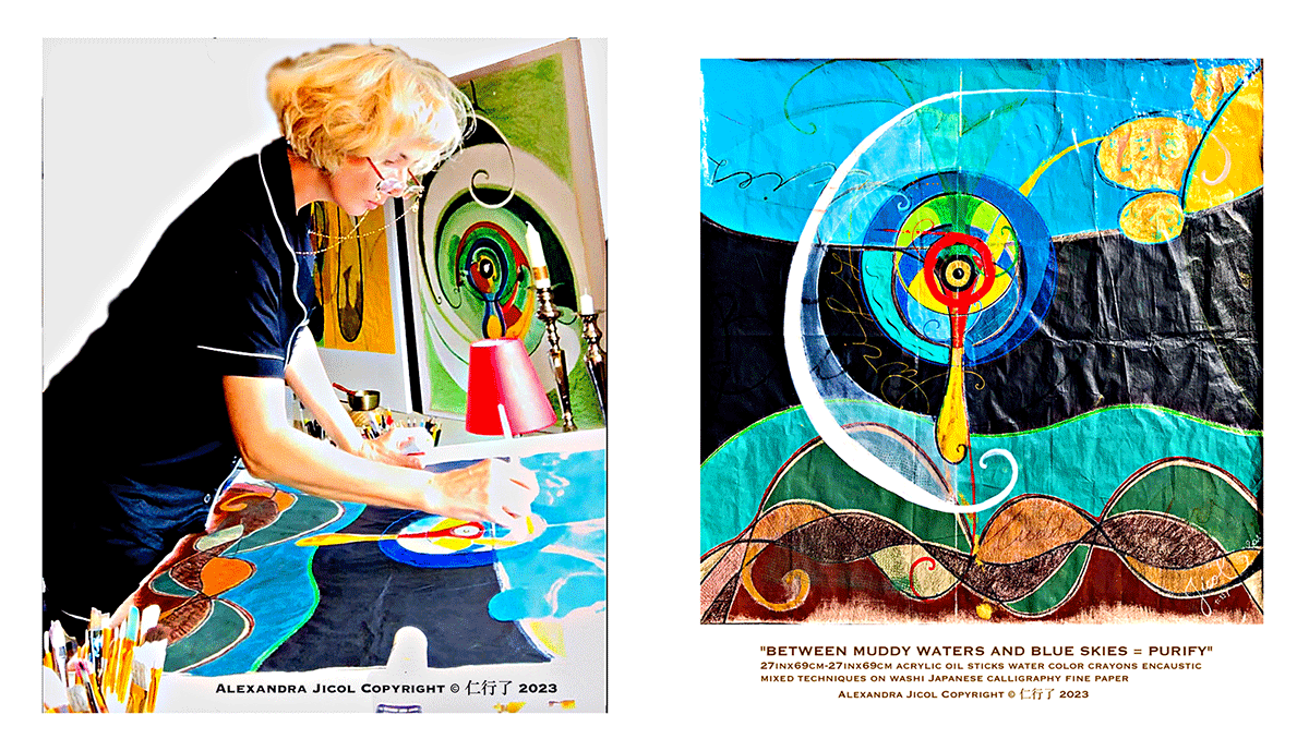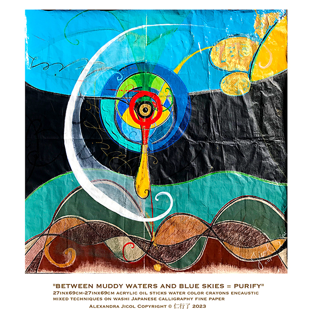 One of Jicol’s recent works, titled Between Muddy Waters and Blue Skies = Purify, reads like a visual diary of the soul’s search for equilibrium. Built on Japanese calligraphy paper mounted on wood, it’s a long, narrow piece—27 by 69 centimeters—but it holds a world inside it.