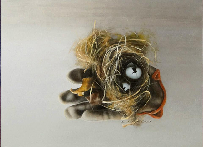Take A Mother’s Glove, for instance. It’s not a grand canvas, yet it holds volumes. At its center, a nest is cradled in the upturned palm of a glove. Inside, eggs are cracked open, life in mid-emergence. The glove is worn, abandoned maybe, or preserved with care. It could be a literal object or a metaphor—for nurture, for absence, for memory itself. There’s tenderness here, but not sentimentality. The hay is tangled, the shells are broken, and the glove is softly faded. It’s about beginnings, endings, and the hands that hold us through both. You can almost feel the weight of time resting in the fibers.