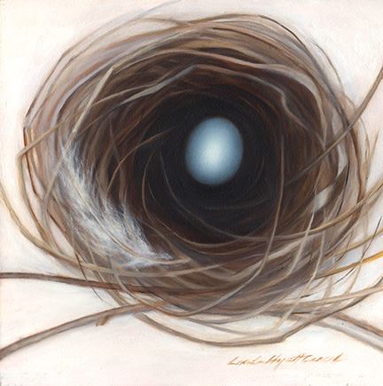 In Light at the End of the Tunnel, Cancel turns her gaze inward. A single egg lies at the dark heart of a swirling nest—no longer in nature, but suspended in a kind of soft white void. There’s a hum to it. The composition pulls you inward. The eye is led through circles of twig and straw, drawn into the soft gleam of the egg, glowing faintly blue. It’s not just about the egg. It’s about the space it occupies—the hush around it, the tension of potential. You’re not sure whether the egg is waiting to hatch or simply holding light. Either way, it feels sacred.