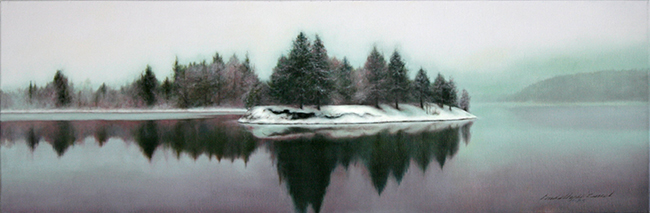 And then there’s Rhapsody in Rose Quartz and Serenity. It’s a shift in mood and scale. Gone are the objects of symbolic still life. Instead, we face a winter island—a real place, softened by fog and reflected in still water. The trees stand in a long row, silent and watching. Their mirrored shapes stretch downward into the lake, as if the land itself is peering into memory. There’s no direct drama, but the quiet is potent. The color palette leans into soft violets, greens, and powdery grays. It feels like waking in a dream you’ve almost forgotten. It’s less a landscape and more a held breath.