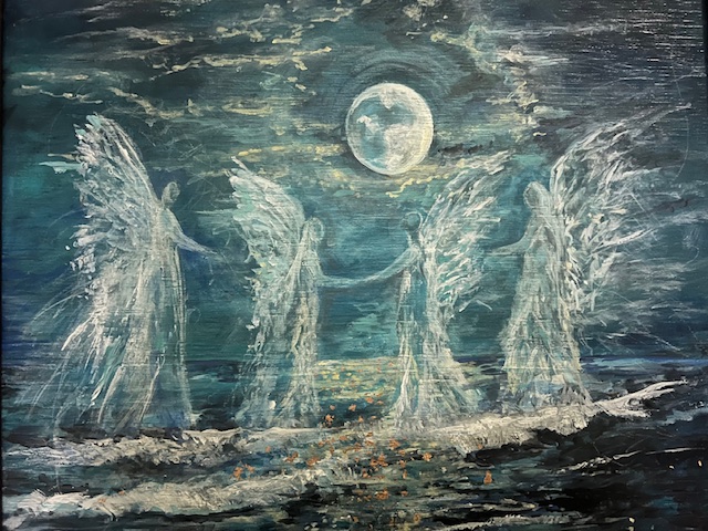 The first is Full Moon on Topsail Island. It’s a monochromatic acrylic painting—quiet, restrained in palette, yet full of layered meaning. To Cheryl, this piece represents the act of calling in helpers from the spiritual world. The moon, especially in its fullness, holds a particular kind of energy. It’s reflective. It’s magnetic. It asks you to trust. In this painting, the moon doesn’t just shine—it whispers. It’s about trusting signs, embracing silence, and opening up to downloads of guidance. The ocean, too, plays its role. She paints the sea not just as scenery, but as presence—a place where magic and clarity meet.