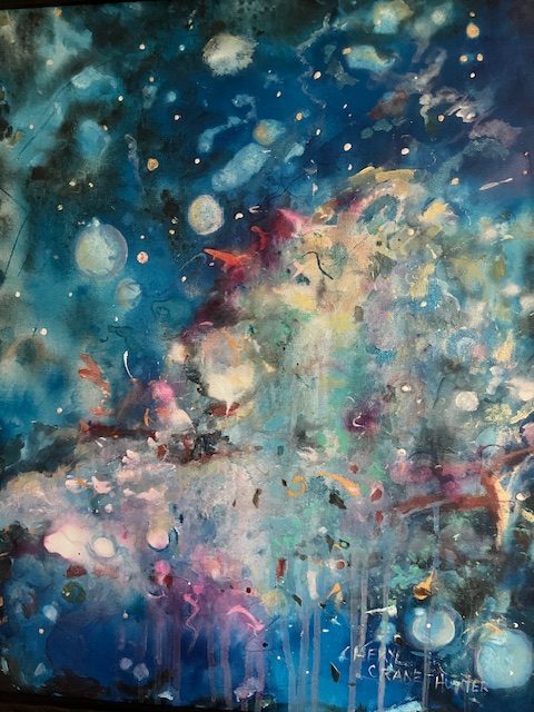 Then there’s Over the Rainbow, maybe the most personal of the three. She painted it as her father was dying of cancer. There’s grief in it, but also peace. Cheryl realized during that time that love is the only thing we arrive with, and the only thing we leave with. The painting is a swirl of blues—dripped, dragged, allowed to move freely. The color doesn’t just sit on the canvas; it travels. It carries the idea of passage. Water becomes sky. Pain becomes love. This work was shown at the Wilmington airport in a show called “Implants,” which touched on the idea of migration and settling—how we arrive in a place with our own history and spirit. For Cheryl, this painting carried both her father’s departure and her own sense of belonging to something wider.