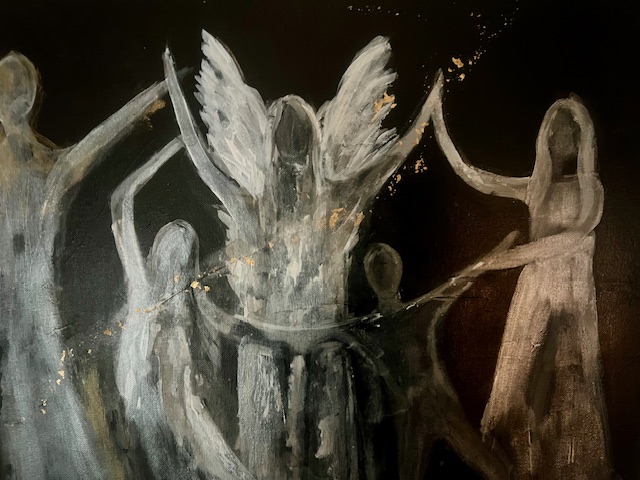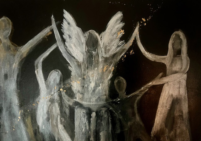 The second piece, The Dance, carries a different kind of rhythm. Here, the palette opens up slightly. The brushwork takes on movement. This painting is about Lemuria—a concept from myth and metaphysics often described as a peaceful, pre-Atlantean civilization. For Cheryl, Lemuria is less a place and more a feeling: heaven on Earth. In The Dance, that feeling comes through as movement between shadow and light. Transparent washes let the forms glow. Shadows give them weight. It’s a dance between what’s visible and what’s hidden, a lifelong exploration of balance through painting. This is where Cheryl’s skill in composition really shines—everything is intentional, yet nothing feels forced.