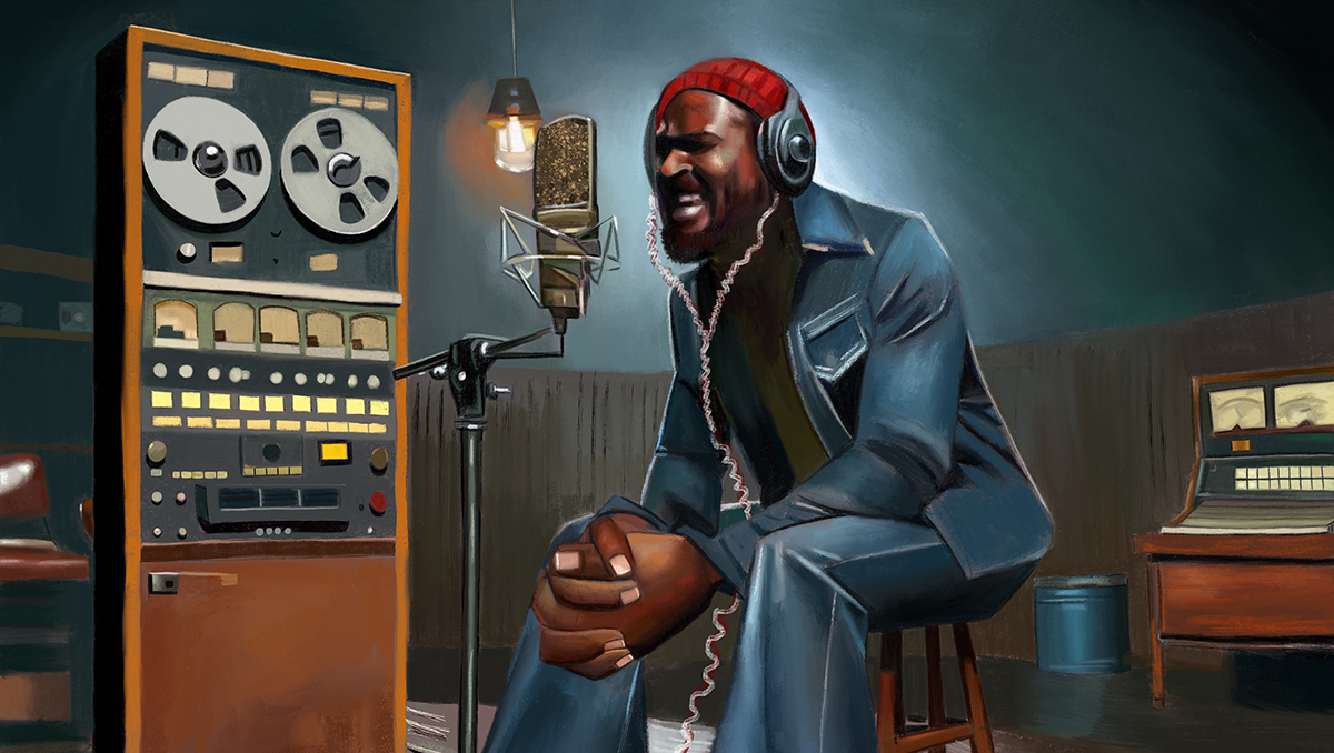 In “Marvin Gaye Studio Sessions 1,” Kairi captures a quiet storm. Marvin is shown seated in the studio, recording Let’s Get It On. He wears the red cap and denim jacket known from the album photos, but this isn’t just a snapshot. It’s a full mood.