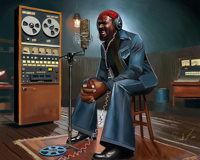 The painting draws us into the recording booth—wood-paneled walls, vintage reel-to-reel spinning, and Marvin fully immersed, headphones on, hands clasped. He isn’t posing. He’s working. And Kairi paints that moment of emotional focus with tenderness. You get the feeling this isn’t just about Marvin—it’s about what it means to be deep inside your art.