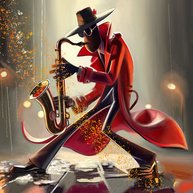 “Midnight Melody” moves slower. It’s a late-night kind of painting. A lone saxophonist stands beneath a streetlamp in an empty alley. He plays, but there’s no crowd—just the echo, the shadow, the stillness. Kairi doesn’t show the music, but he paints its atmosphere.