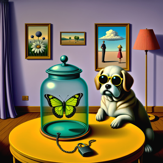 Take A Flutter. It’s an image with a sense of humor at first glance: a laid-back dog in sunglasses, posed like it’s on vacation. Next to it, a butterfly flits inside a locked jar. They share a frame, but not the same kind of freedom. One is a beloved pet, living within the bounds of affection. The other is trapped in a literal prison, colorful and frantic. Brown doesn’t tell you what to think—he just places both versions of captivity side by side and lets the tension hum. It’s about how we treat living things, the lines we draw, and the comfort we sometimes confuse for care.