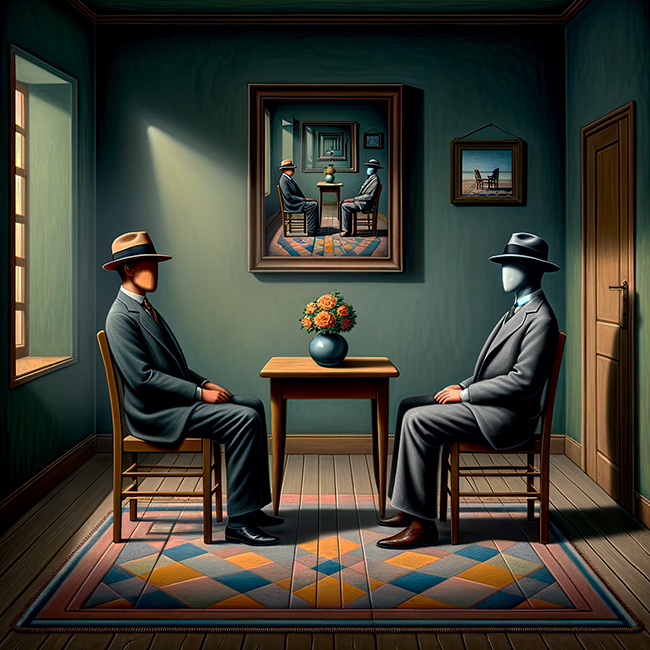 Then there’s A Meeting of Minds, which takes things into a dreamlike zone. Two men stand facing each other. They’re featureless—no faces, no expressions. Between them is a painting of themselves, creating a loop. You’re not sure where the conversation begins or ends—or if there’s one at all. With no facial cues to go on, the whole idea of communication gets put under the microscope. Can people understand each other when all the usual signs are gone? Is it connection or just reflection? There’s a little humor here, but also a quiet unease. Brown seems to enjoy the ambiguity. He’s not offering answers—just letting the moment stretch and echo.