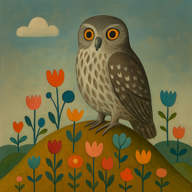 Birds of a Feather carries a different kind of weight. It’s brighter, softer, and more playful on the surface. An owl with glowing orange eyes sits on a green hill scattered with cartoon-like flowers. There’s a single cloud in a pale sky. It could be a page out of a picture book. But then you notice the stillness. The owl’s eyes don’t blink. The flowers don’t sway. Everything feels slightly too placed, too arranged. Nature is present, but it’s been tidied up. Brown’s flat shapes and careful composition echo folk-art styles, but they’re not naïve. The painting touches on how humans reshape wildness to make it more palatable—controlled, ornamental, safe. It’s a sweet image with sharp edges.
