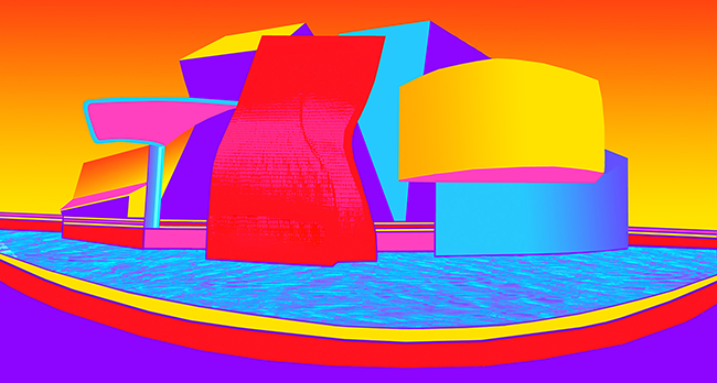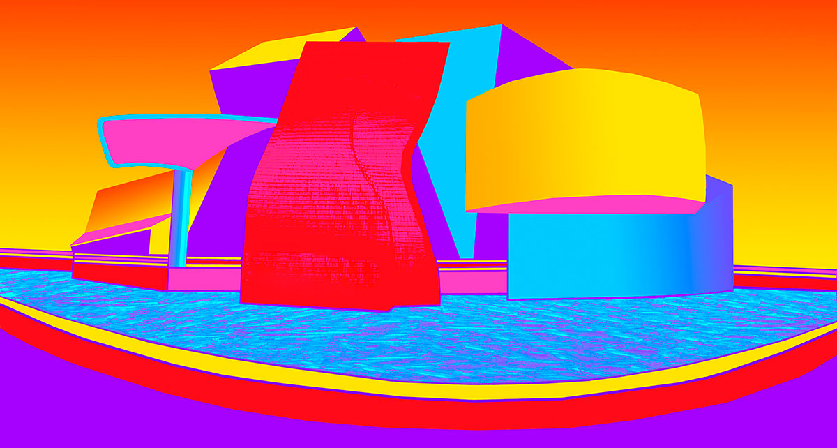 The buildings stay recognizable, but the world around them shifts. Orange skies, electric gradients, water that looks like stained glass. She isn’t aiming to replicate Gehry’s designs—she’s responding to them. Bending space, flattening shadows, heightening contrast. The images become something else entirely—less about place, more about feeling.