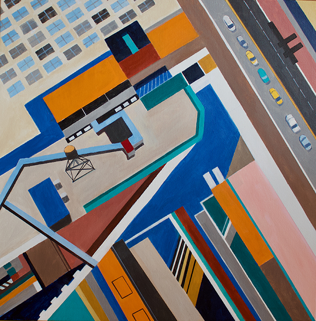 Born in Philadelphia and now based in Manhattan, Toni Silber-Delerive brings a graphic, bird’s-eye view to the world around her. Her background reflects a deep and steady dedication to art. She studied painting at the Philadelphia College of Art, earned a BFA and art education certificate from Kean College of New Jersey, and furthered her skills in graphic design and silkscreen at New York’s School of Visual Arts. That mix—fine art training, education, and graphic design—makes sense when you see her work. It’s thoughtful, clean, and intentional, but it’s also bold and visual. Her paintings aren’t just observations; they’re designed.