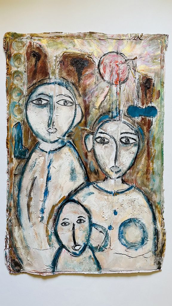 Each canvas works like a portal, pulling the viewer into shared spaces that once held many lives. The materials—organic in feel and often rough to the touch—echo this: clay, charcoal, handmade pigments, natural fibers. Together, they suggest something rooted, handmade, and lived-in.