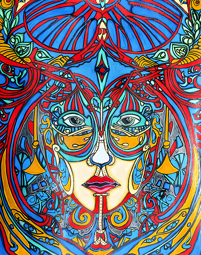 The themes in this piece echo throughout McGuiness’s larger body of work. She’s fascinated by duality—sacred and strange, playful and profound, concealment and exposure. Her art often mixes organic textures with sharp symbols. There’s a tactile quality to what she makes, a visual rhythm that speaks to pattern and ritual, but it’s never static. It moves. It asks.