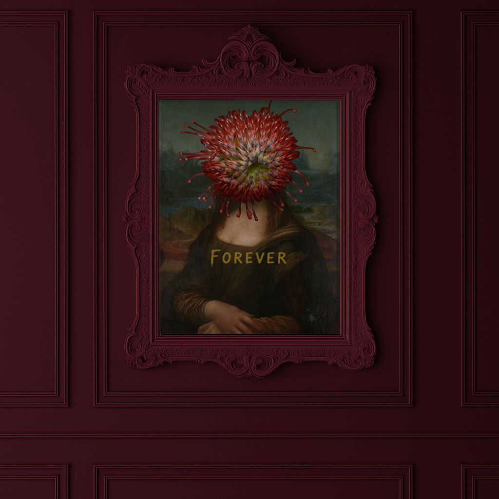 Placed in a rich maroon, baroque-style frame and background, Forever Bloom Bloom plays with ideas of permanence and decay. The ornate frame references museum culture and institutional prestige, while the deep red walls recall luxury, passion, and blood. Wong surrounds the work with a sense of high drama and timeless display, as if daring viewers to accept this reimagining as canon.