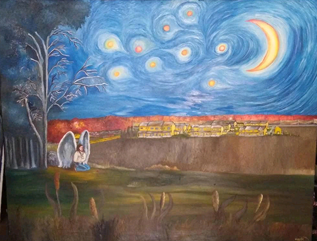 A third canvas again looks upward, recalling Van Gogh’s turbulent stars, but this time the earth is equally present. In the foreground, an angel kneels, wings folded, head bent. Behind, a town glows warm with light, while the field between lies shadowed.