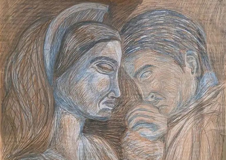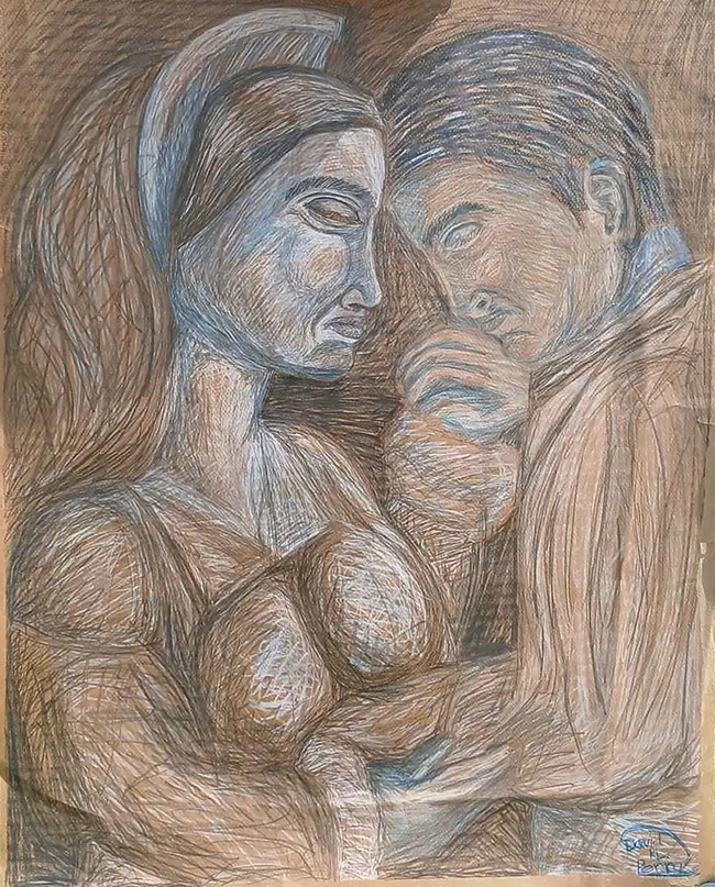 Another piece leaves the landscape behind and moves to intimacy. Two figures stand close, heads leaning together. Their bodies are drawn in layered browns, grays, and whites, built up like stone or carved wood. They look heavy, but their closeness softens that weight. The man leans in, the woman steadies, and in their shared space there is tenderness.