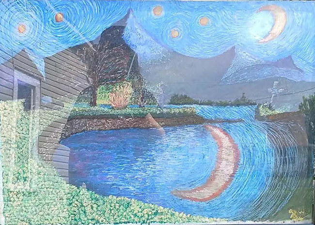 One painting borrows from Van Gogh’s Starry Night but speaks with David’s own voice. A river flows under a sky alive with motion, a crescent moon above and again in reflection below. A house and trees ground the scene, yet the sky carries the real drama, restless and filled with light. The doubled moon suggests dual vision, the idea that what is seen once can always be seen again in a different way.