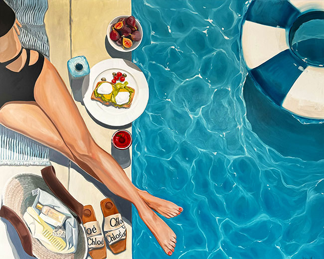 Harmony (150 x 120 x 4 cm), part of the “Reborn” series, captures a fleeting yet grounded moment. A woman’s leg rests beside a pool, steeped in the ease of a French summer. At first glance, the scene feels light and unhurried, but it carries weight in its stillness.