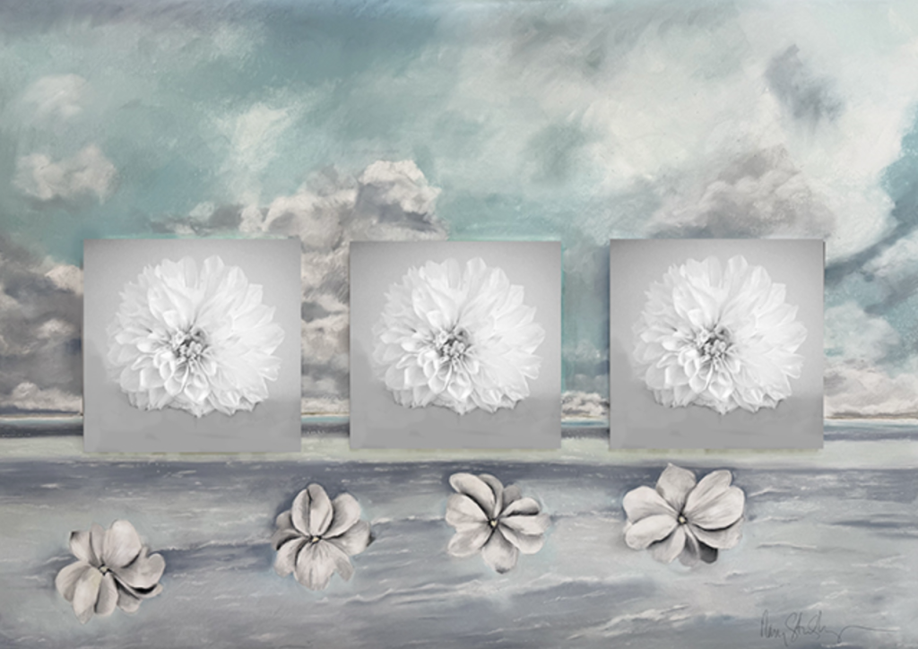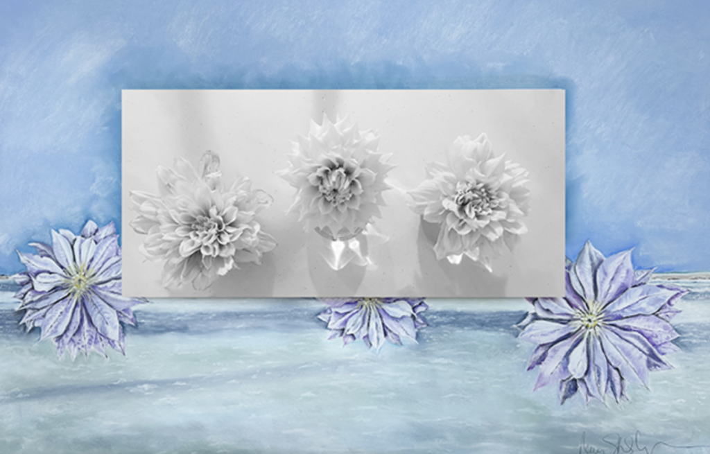 Across this backdrop sits a rectangular photograph with three blooms in grayscale. Each is bold, its petals reaching with quiet force. The central bloom feels strongest, its core defined, its structure almost architectural. Against the soft pastels of the sea, these flowers stand firm, undeniable.