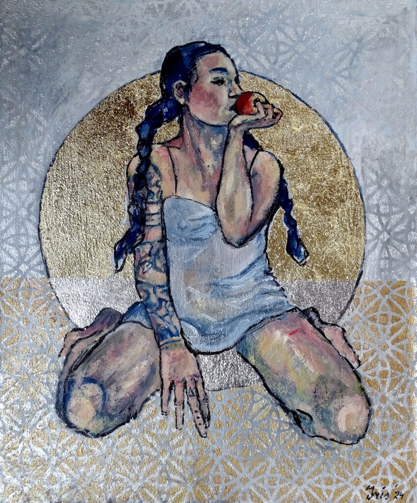 A woman holding an apple enters the scene, a nod not only to Midas but to other tales of temptation. Against the metallic glow, the apple becomes the fragile center of the work—ordinary, edible, and at risk of loss. The shine draws us in, but as we linger, the brilliance becomes isolating, an emblem of how desire can devour the simplest pleasures.