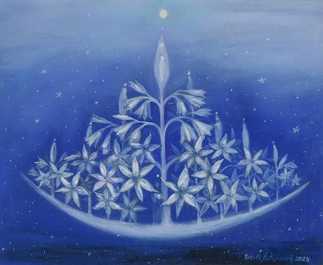 Taken together, these two paintings mirror the conversation that defines Antonovich’s art: ascent and descent, awakening and introspection, the visible world and the invisible one beneath it. Her work doesn’t seek attention—it offers rest. In a world that prizes noise and speed, she paints the value of quiet.