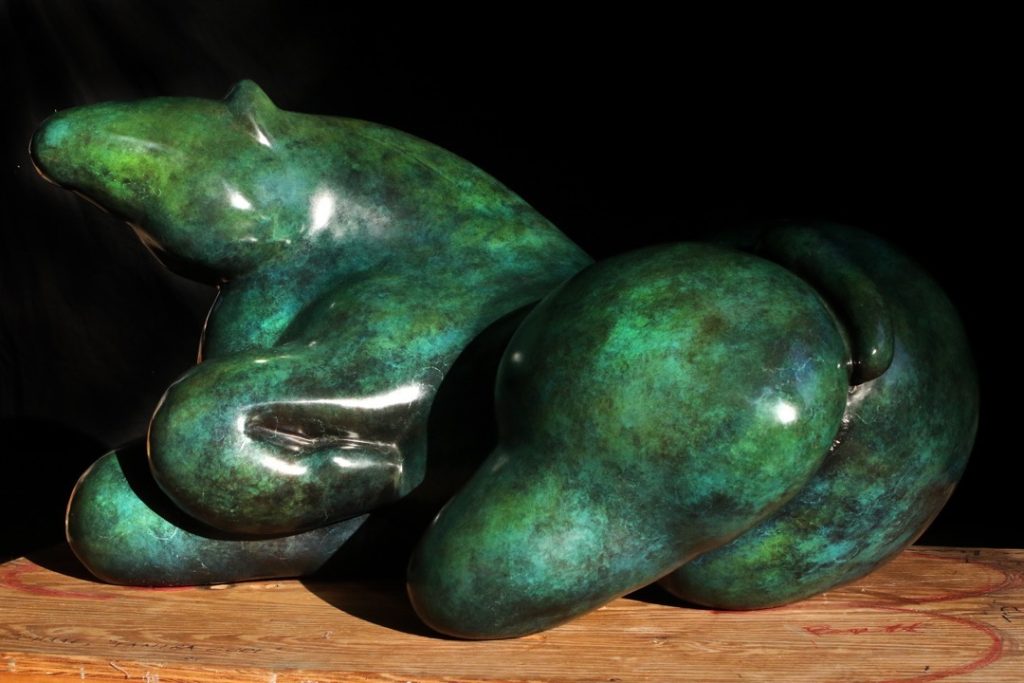 Patination, the coloring of metal through fire and chemicals, is something Schaaf describes as “watercoloring with fire.” The phrase captures the tension between control and unpredictability. In Tantra Gurl, this alchemy gives rise to layered browns and greens, tones that resemble the sacred stones used in tribal carvings. She glows faintly, as though lit from within—a creature made of earth but shaped by spirit.