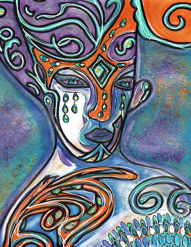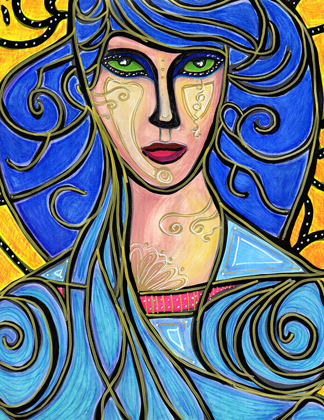 McGuiness infuses Isolde with kinetic energy. Where Luna drifts inward, Isolde reaches outward, stretching toward the unknown. Her palette shifts to deeper tones—indigo, gold, and violet—colors that move like light across space. Each brushstroke radiates purpose and freedom, expressing the tension between vulnerability and illumination.