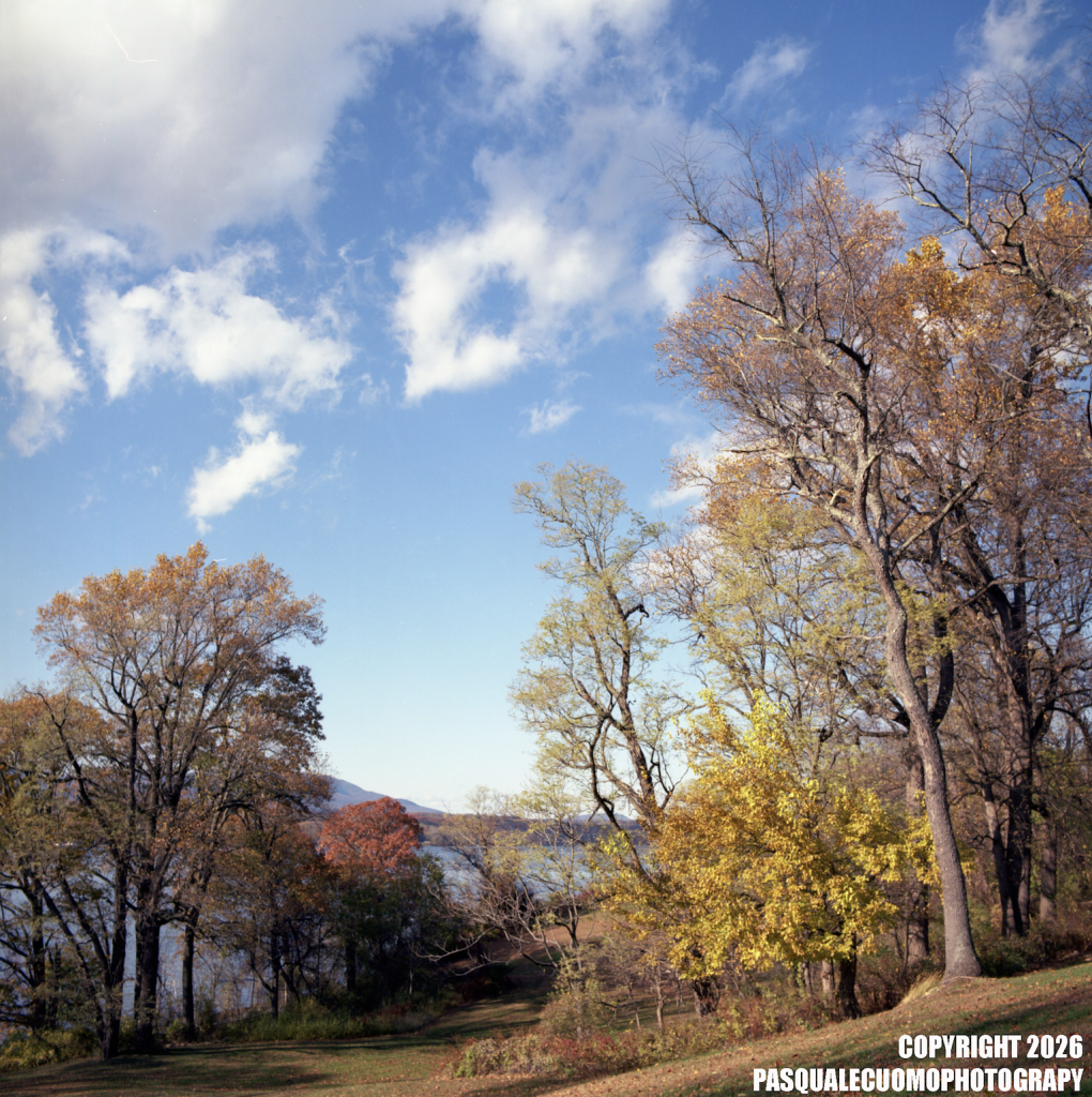 In the Croton Reservoir Park photograph, the sky takes up generous space, and that decision shapes the whole feeling. Soft clouds break the blue so it stays active, not flat, and the sense of openness becomes the atmosphere of the image. Beneath that, the trees sit in that in-between stage late fall often brings: some still holding onto color, others already bare. It’s not a tidy “peak foliage” postcard. It’s a more truthful moment—change happening unevenly, branch by branch.