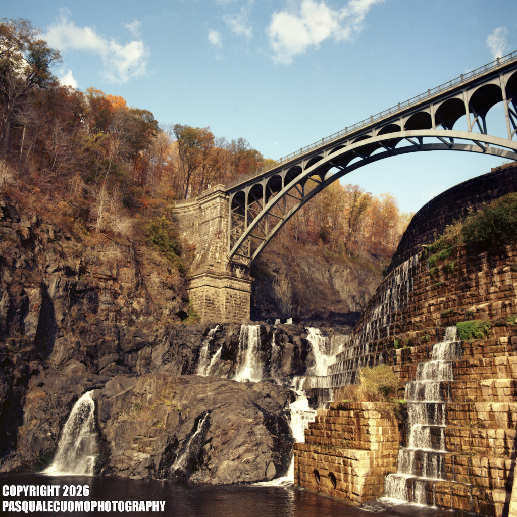 The Clermont State Historic Site photograph pivots from open space to built form. Here, the image is organized around structure—curve, mass, and the presence of something engineered. Cuomo frames a large arched bridge crossing the scene against a pale sky, with autumn trees gathered behind it. Below, the view drops into rock, water, and stonework, a dense mix of textures that could easily become chaotic. But the photograph stays readable because the bridge provides a strong, simple sweep that holds everything in place.