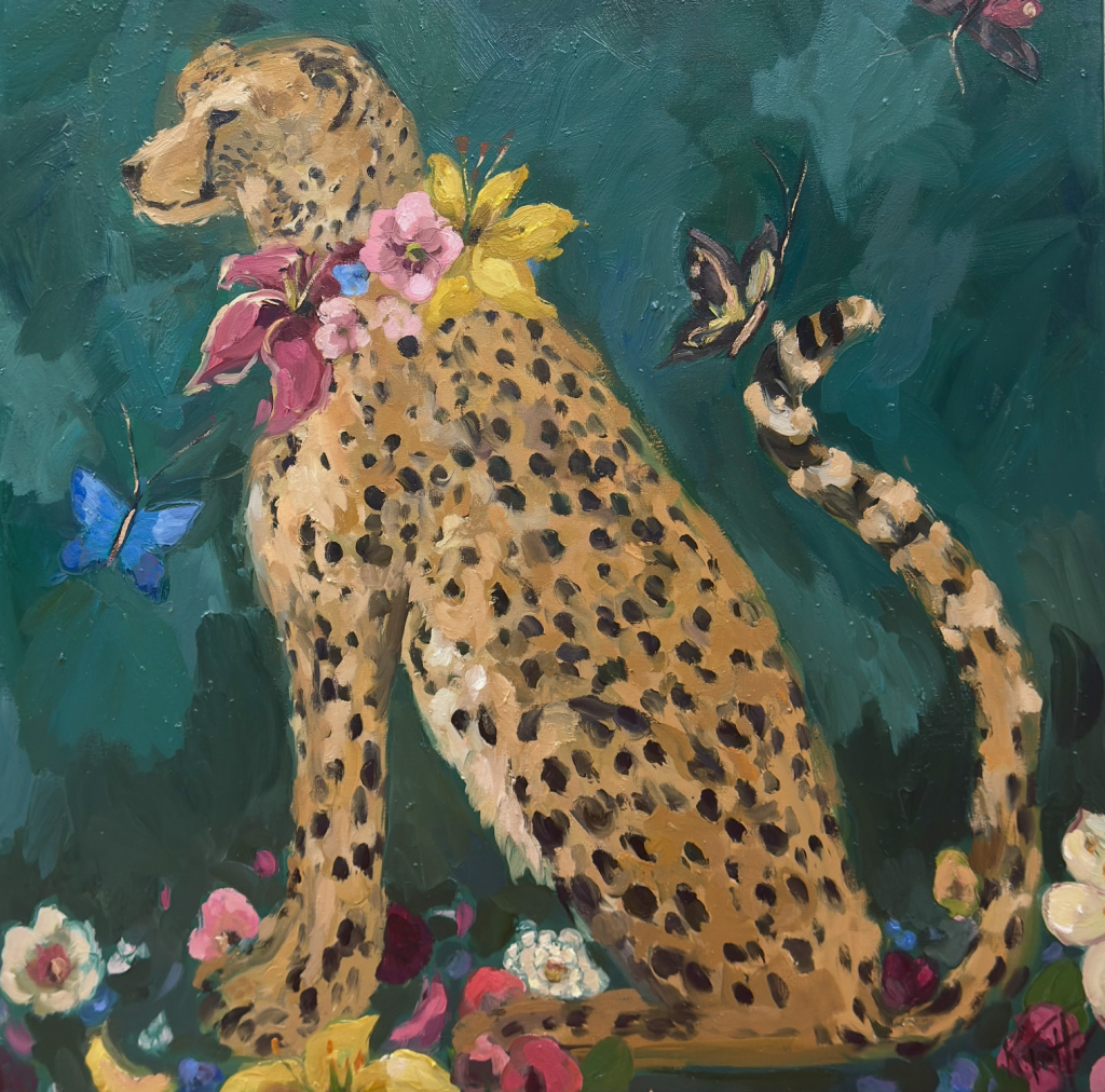 “Lilly Ruben” is a 36×36” cheetah portrait, described as bold and colorful, with the animal wearing a dramatic collar of flowers. The square format supports the directness of the composition. It keeps the cheetah front and center, like a formal portrait that refuses distraction. The floral collar works on multiple levels. It frames the face the way a historical ruff might frame a sitter, turning the cheetah into something almost ceremonial. It also gives Trotter room to amplify her strengths: building rhythm through repeated shapes, stacking colors so they vibrate, and using thick paint so petals feel constructed rather than merely depicted. There’s a satisfying push-and-pull in the idea itself—sleek animal energy against lush floral abundance, speed against flourish. The painting doesn’t ask you to admire the cheetah from a safe distance. It brings the personality right up close.