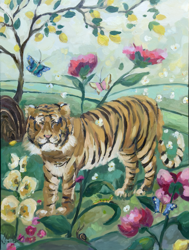 Where “Lilly Ruben” feels concentrated and iconic, “Le Tigre” opens outward into a fuller, more immersive setting. At 36×48”, it gives Trotter more room to build a world. The painting belongs to her “Life in Bloom” collection and is described as a vivid scene featuring a tiger within a chinoiserie-inspired environment filled with flora and fauna. That’s a natural fit for her. Chinoiserie carries its own history of decorative storytelling—patterned landscapes, stylized nature, ornamental abundance. Trotter uses that language as a stage and sets the tiger as the anchor within it. Pattern becomes environment. Ornament becomes narrative. The scene feels curated and lush without flattening into mere decoration, because the tiger holds the center with authority.