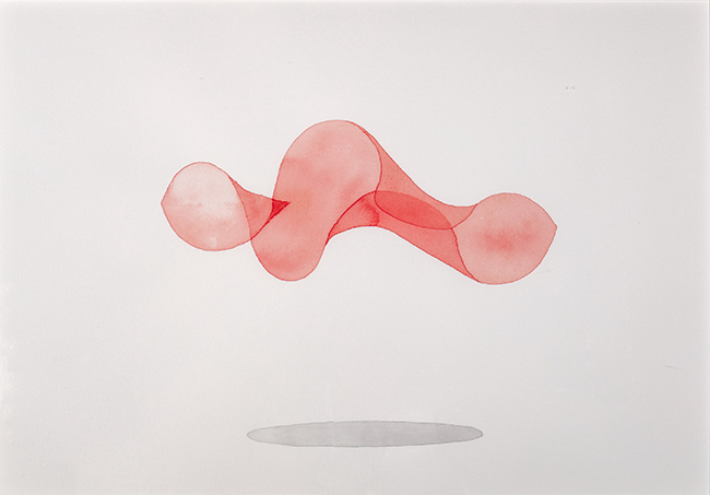 If Color Wave holds many parts in one field, Kyong’s watercolor series Undulation leans into motion—internal motion, the kind that’s hard to pin down but easy to recognize in yourself. The series includes five paintings centered on a simple square that appears to move through space. The form stays basic, but its behavior becomes expressive. It lifts, dips, tilts, and shifts posture like a body does in moments of uncertainty—wanting to move forward, feeling a tug to pull back.