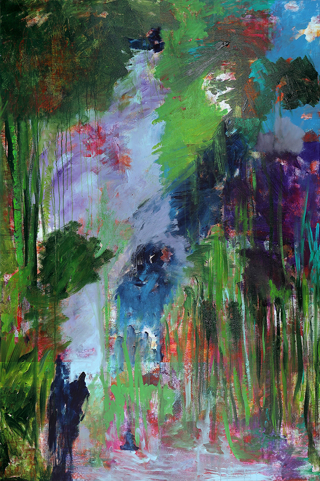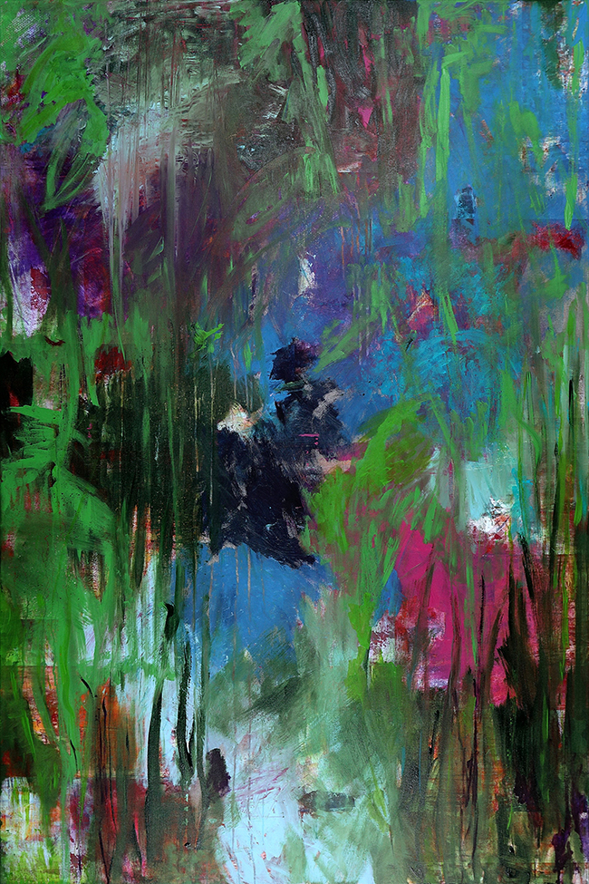 In the first painting, a lighter zone opens near the center—like a break in density, a strip of air, a route forward. It could read as light through leaves, a stream cutting through growth, or just a breath of space inside a crowded field. Around it, deeper areas push inward: heavy greens, pockets of purple, and brief red flashes that land like signals—life, warning, bloom, pulse.