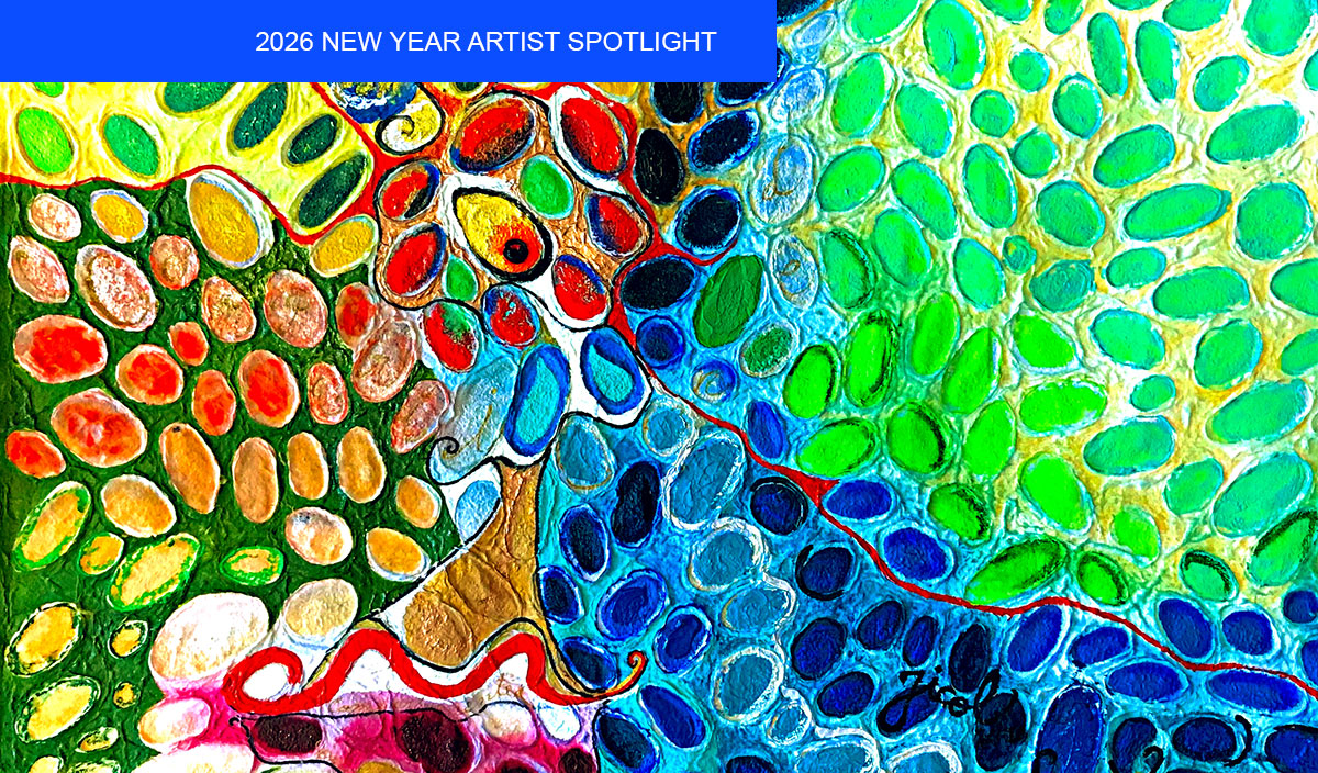 Her painting “Compartmentalized Emotions” (2025–2026) shows where her focus currently rests. Working with heavy body acrylic, oil sticks, water crayons, and mixed techniques on thick Asian handmade paper, she creates a surface that keeps evidence of each decision. The texture is visible. There is no attempt to hide revisions. Overlapping marks and meeting colors reveal the painting’s timeline.