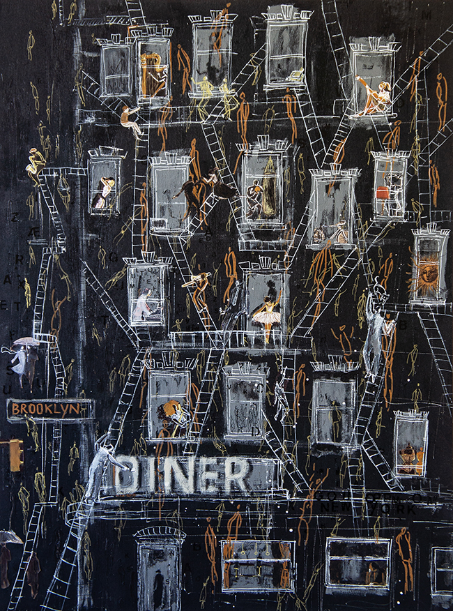 Here, the skyline is reduced to its structural elements. Buildings act as containers. Windows become frames. Fire escapes stretch across facades, organizing the composition into a network of intersecting lines. Constructed from collage, acrylic, and enamel on wood, the surface feels assembled and tactile. In contrast to the open movement of gold in the earlier work, this painting is deliberately segmented.