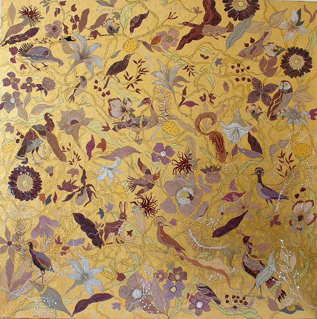 The color choices are intentional and restrained. Plum and blush hues introduce warmth and depth, offering a quiet counterpoint to the reflective gold. The tones feel organic, evoking natural growth while remaining open-ended. Branches reach and intersect. Leaves collect and disperse. Within this layered environment, birds and small animals appear—sometimes clearly visible, sometimes suggested through form and movement.