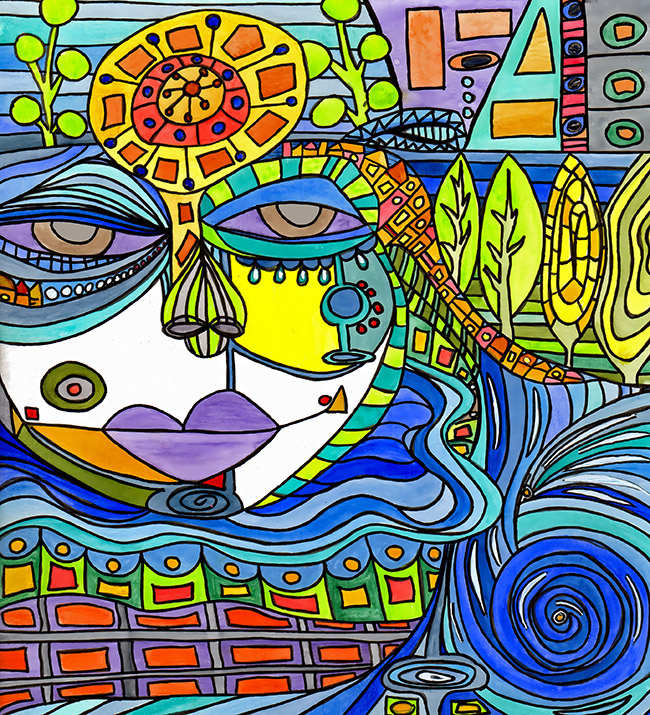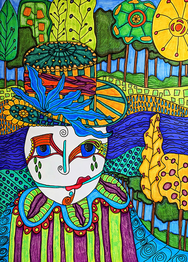 One artwork that reflects this approach is The Grounds Keeper, a painting that centers on the idea of stewardship. The composition introduces a central figure surrounded by a richly colored and patterned natural environment. Trees, water, and sunlight form a rhythmic landscape where each element seems connected to the others, creating the sense of a balanced and living ecosystem.