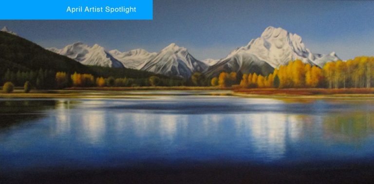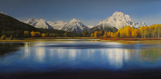 Alongside the book, her recent commissioned painting, Mount Moran – Grand Tetons (24″ x 48″, oil on linen), returns to the landscape that has long grounded her work. The painting opens onto a wide view of the Tetons, with Mount Moran rising in the distance. In the foreground, a still body of water reflects the mountains and sky above. The composition is straightforward, yet the handling of light gives it depth.