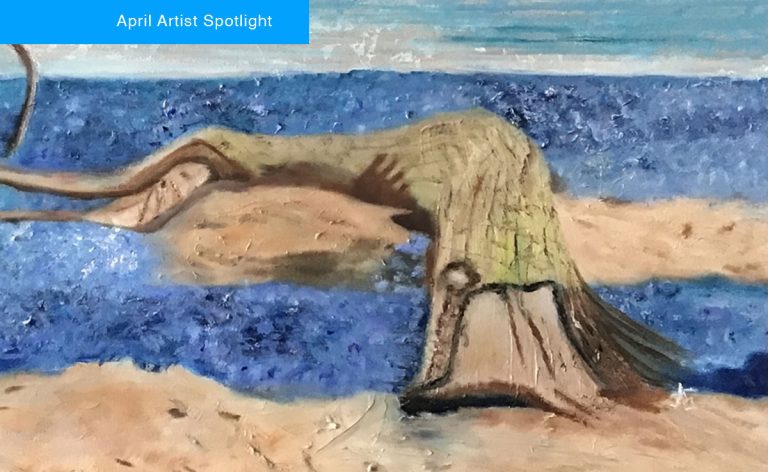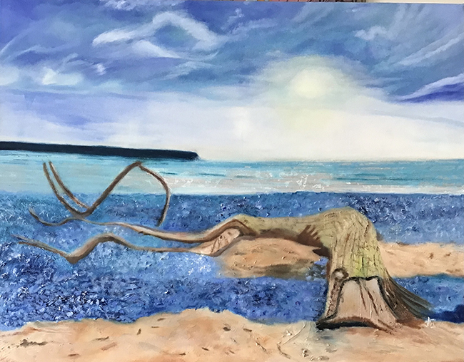 A fallen tree stretches across the center of the composition, reaching from the sand into the water. Its elongated form guides the eye across the painting, acting as both a physical object and a subtle symbol. It suggests interruption, transition, or the quiet trace of something that has already occurred. Though there are no figures present, the space does not feel empty. Instead, it holds a quiet sense of presence, as if something lingers just outside view.