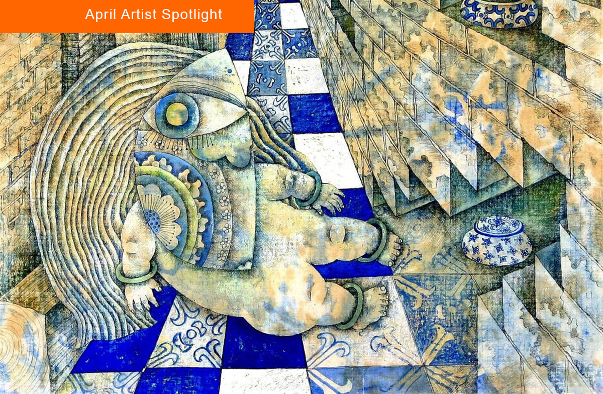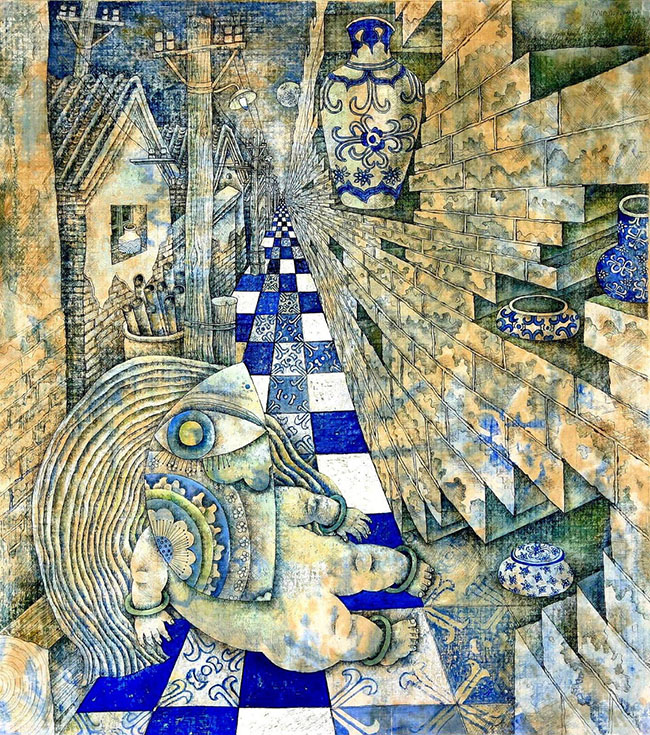 In contrast, Windless Day carries a quieter, more introspective mood. The composition draws the viewer into a narrow alley space, structured by receding perspective and a patterned floor that pulls the eye inward. Blue-and-white ceramic motifs appear throughout the scene—vases, tiles, and decorative elements—creating a visual rhythm that echoes traditional Chinese design. These forms are precise yet slightly distorted, giving the impression that the space is shifting or bending under the weight of memory.